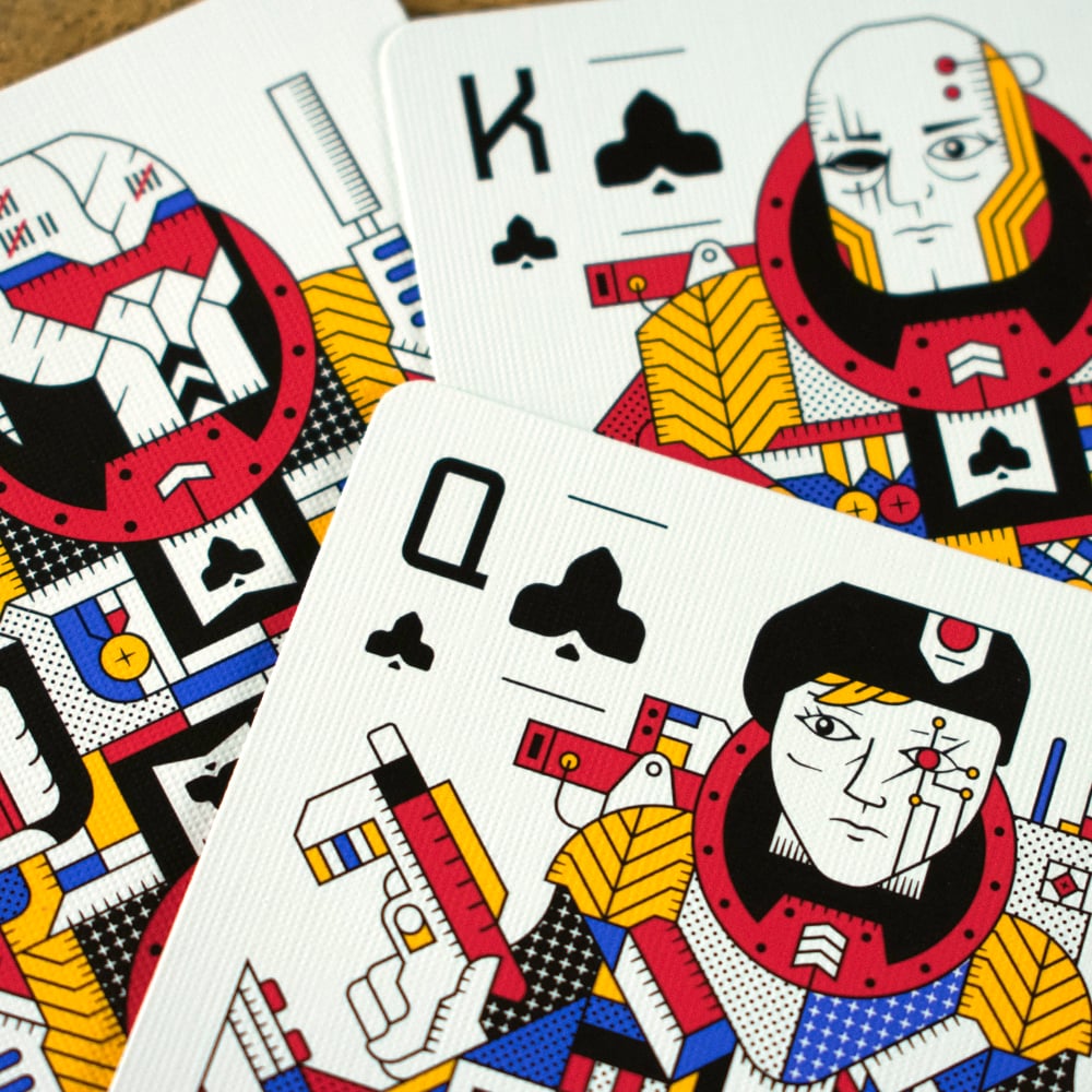 STARDECK is a set of sci-fi themed playing cards. Each suit represents a classic sci-fi trope: Space Marines, Robots, Aliens, and a dastardly Mega Corporation. Cards are printed by the United States Playing Card Company on high-grade Bicycle paper.